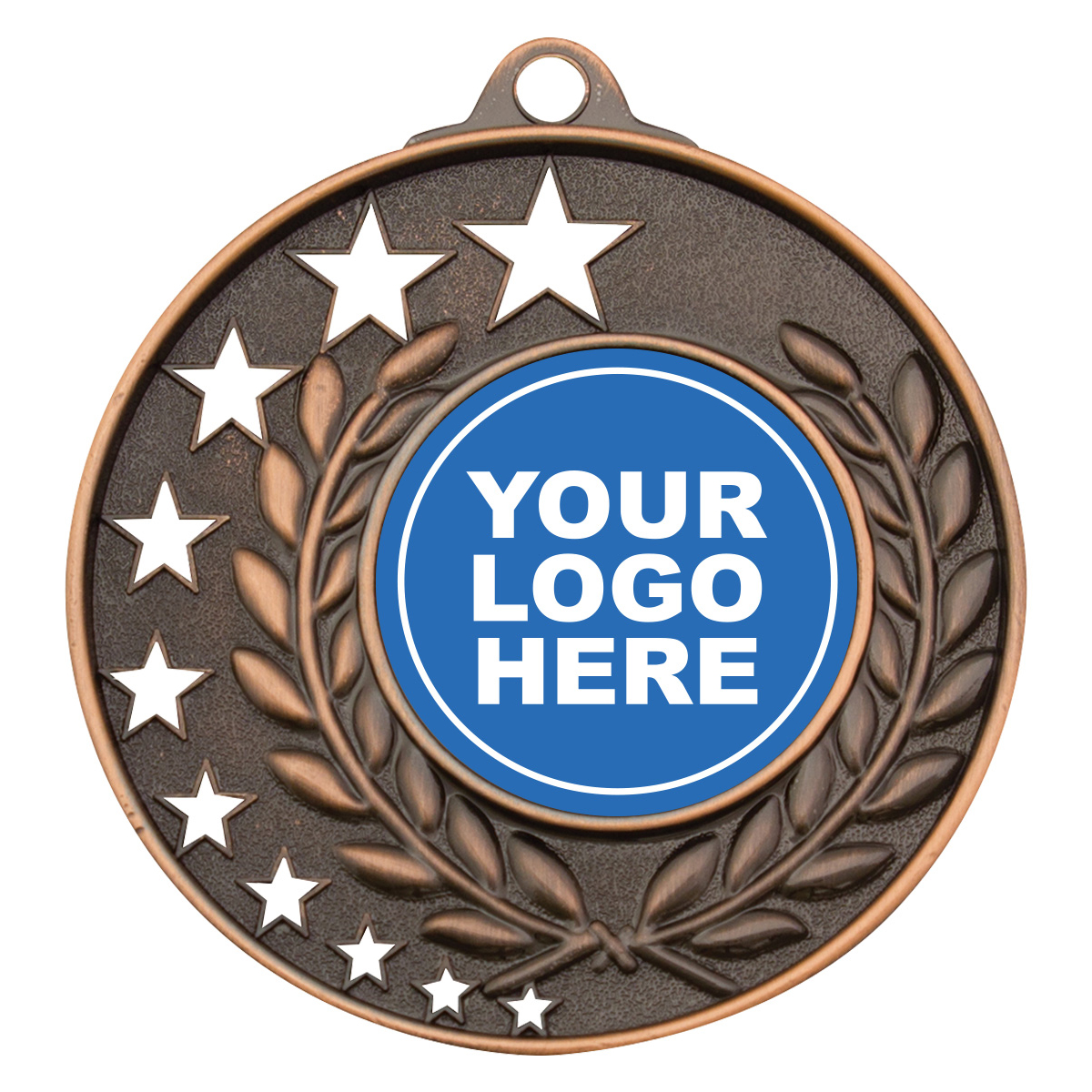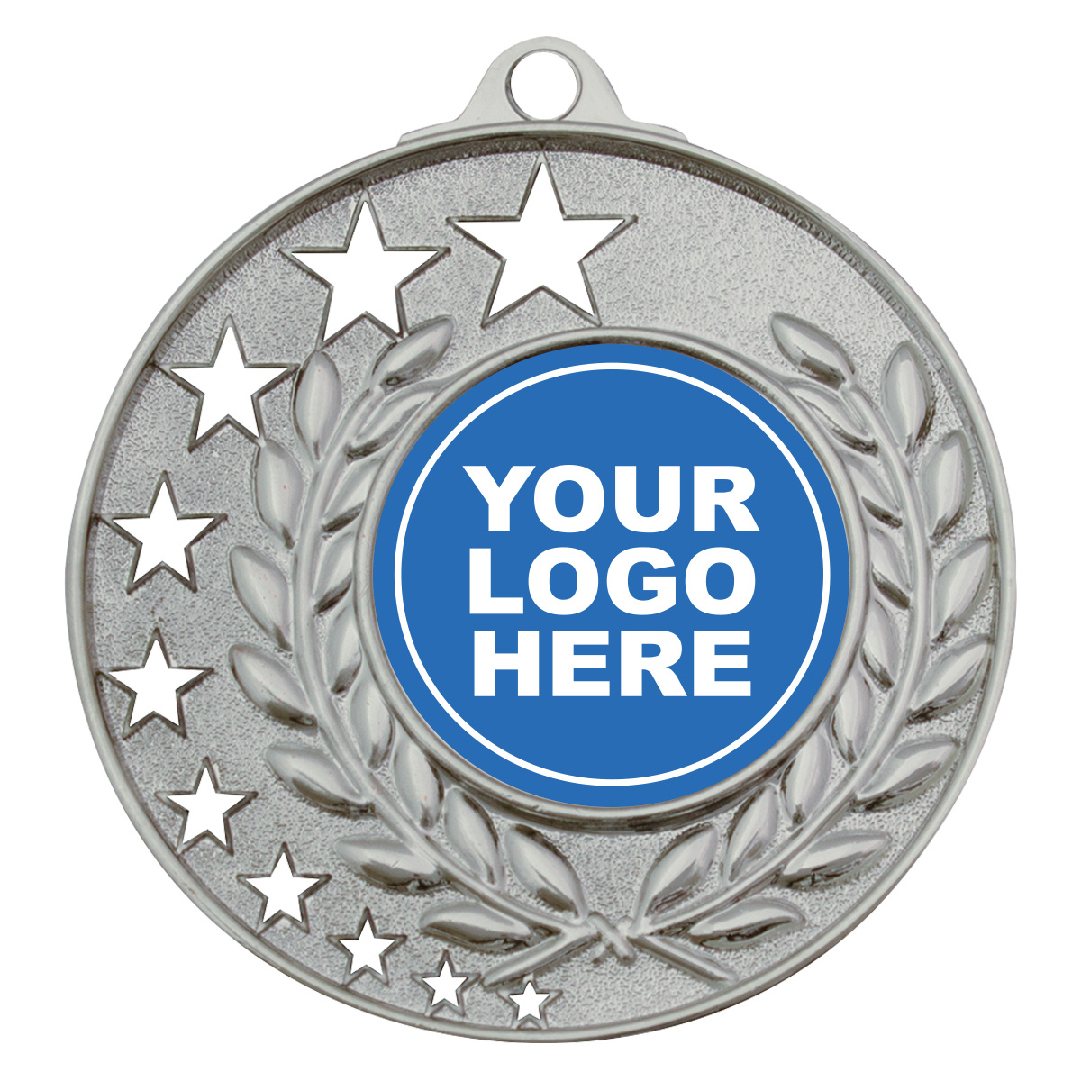 Star Series medal in gold, silver and bronze. Special design features stars and commemorative wreath with space for 25mm insert. Inserts for all activities and consider personalised custom logo centres. Ribbons in all colours and medal presentation boxes also available.